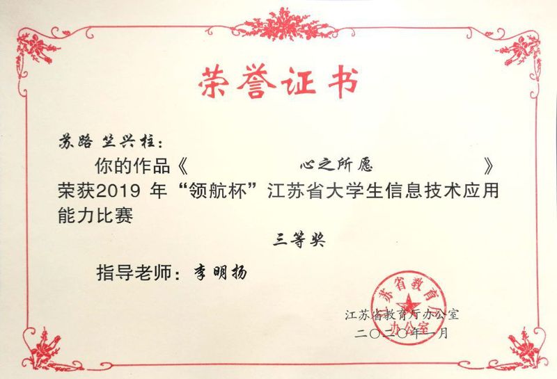 在2019年“领航杯”江苏省信息技术应用能力大赛中,买球官网李明扬老师指导的多组同学参加了该项比赛。其中苏路、竺兴柱同学报名参赛的视频作品《心之所愿》荣获三等奖。“领航杯” 江苏省信息技术应用能力大赛是由江苏省教育厅举办的省级赛事,面向全日制在校大学生,参赛作品形式包括微电影、教学微视频、动画作品、网站作品、APP作品、课件作品、软件开发作品等等,该项赛事每年举办一次。(文、图/李明扬)