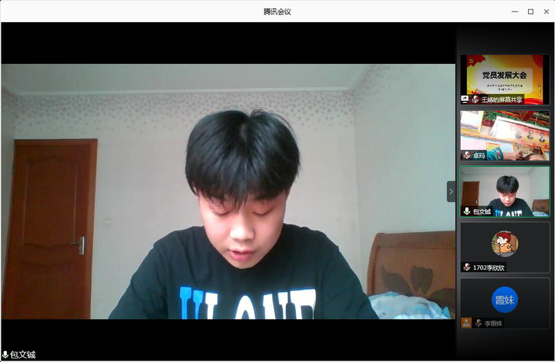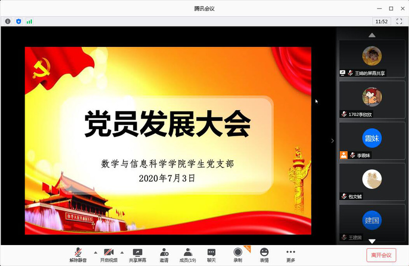2020年7月3日下午2点,买球官网学生党支部在线召开学生党员发展大会。支部全体党员、六名发展对象以及入党介绍人胡作进院长、韩雪、颜无瑕老师一同参加了大会。会议由学生党支部书记李霞妹老师主持。