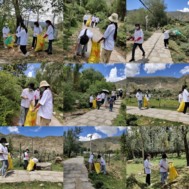 随后的几天,团队分别前往拉萨北郊山和西郊街道进行社会实践。前者地处偏远、人烟稀少,导致长期无人清理,垃圾堆积严重;后者人流量大、很多人随手扔的垃圾被风吹得散落到墙角、草丛等隐蔽角落。团队成员们分工合作、干劲十足,三三两两或行走在山区的羊肠小道上,边走边将路边草坪上的白色垃圾收集在黑色的环保垃圾袋中;或穿梭在热闹的街道上,默默地成为散落各地的垃圾和墙上的小广告清理干净,形成了美丽拉萨的一道靓丽的风景线。