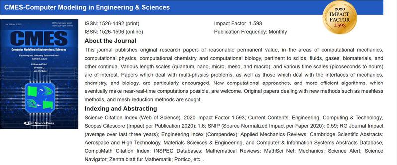 《CMES-Computer Modeling in Engineering & Sciences》2020年影响因子1.5930,期刊SCI分区Q3。该期刊聚焦具有合理永久价值的原始研究论文,旨在向所有对计算材料、计算力学、计算物理等领域的计算机建模和模拟感兴趣的科学家、研究人员、工程师和从业人员传播最先进的科学和技术发展。