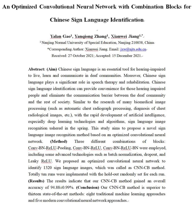 该论文提出了一种基于优化卷积神经网络的新型手语图像识别方法,采用三种不同的块组合,融入BatchNormalization、Dropout和Leaky ReLU等流行技术,对1320幅手语图像进行分类识别,获得了94.88±0.99% 的整体准确度,优于对比的十三种先进方法。该论文也是买球赛十大平台教师国家社会科学基金项目(Grant No. 20BTQ065 )---“基于手语词汇语料库的语义知识挖掘研究”子课题研究成果之一。