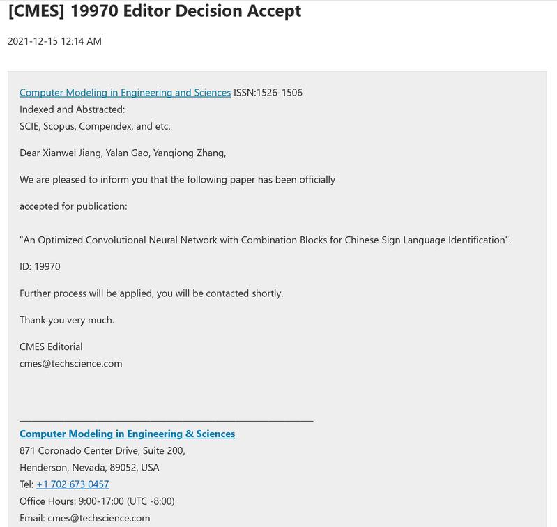 买球赛十大平台学生在发表论文方面取得新突破。学院计算机科学与技术专业本科2018级学生高亚岚,以第一作者身份著作的“An Optimized Convolutional Neural Network with Combination Blocks for Chinese Sign Language Identification”被SCI期刊《CMES-Computer Modeling in Engineering & Sciences》录用,即将发表。