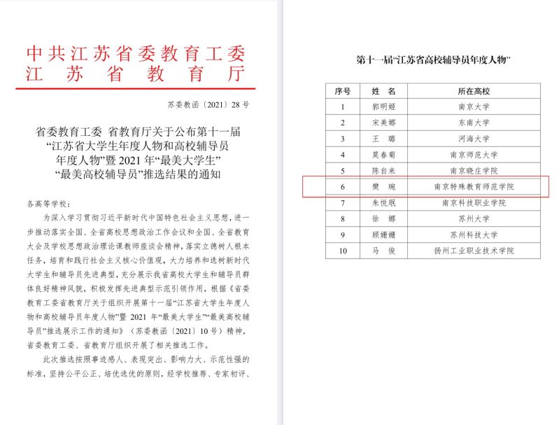 近日,江苏省委教育工委、江苏省教育厅公布了第十一届“江苏省大学生年度人物和高校辅导员年度人物”暨2021年“最美大学生”“最美高校辅导员”推选结果,买球官网辅导员樊琬老师荣获第十一届“江苏省高校辅导员年度人物”。