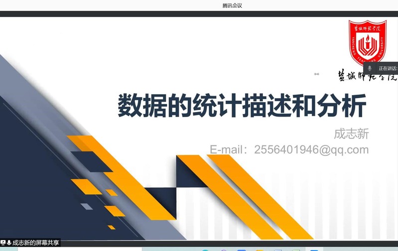 2021年12月21日晚上,盐城师范学院的成志新教授应邀为数信学院数学建模竞赛培训班学生及相关老师作了一场精彩的数学建模线上讲座。本次讲座的主题是“数据的统计描述与分析”,主要为同学们针对性地解决如何处理复杂数据及呈现可视化结果的问题。