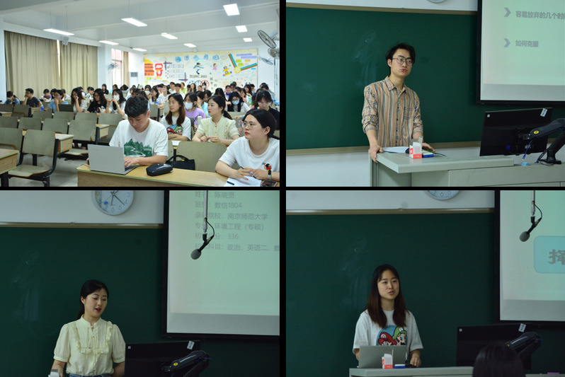 在考研经验分享环节,学长学姐依次上台分享,从自身考研的经历出发,讲述了该如何选择自己的目标院校、如何合理规划时间、如何调整备考心态,鼓励大家要坚定自己的内心,结合实际情况找到适合自己备考的方法。