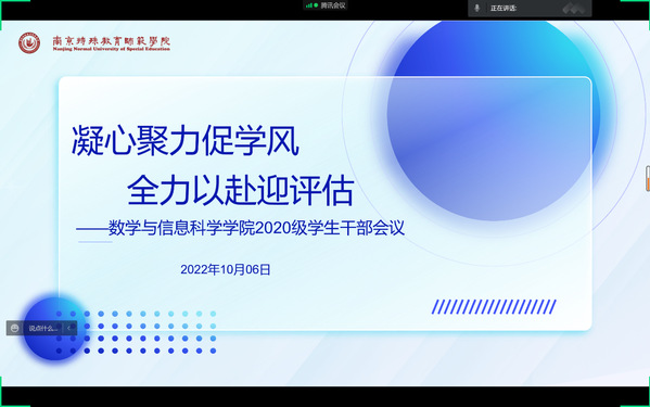 会上,樊琬老师首先结合开学以来,学生评奖评优工作的开展、学院学风建设的落实情况,对工作进行总结;就学校即将迎来的本科评估工作,结合学校第二次党代会精神强调,樊琬老师向学生干部们发出倡议:一是要提高认识、积极参与,二是要严守学校纪律、倡导文明校风,三是要认真学习、努力提高专业技能,四是要加强班级制度学习,倡导积极健康生活。结合学校将要开展的电瓶车集中管理工作要求,要求各学生干部起到模范带头作用,以身作则,绿色出行,号召全体学生干部身体力行为学校迎评工作贡献力量。最后,樊老师强调疫情期间,学生干部要加强班级学风、班风的建设,做好每日健康打卡、核酸检测安排等工作,同时要时刻关注班级同学的心理状态并及时给予相应的人文关怀,及时报备。