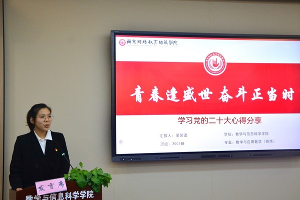 “同学们,你们想过‘我是谁’‘我要成为什么样的人’吗?……我深切感受到了青年之于国家和民族的重要性,我要努力做一名堪当民族复兴重任的时代新人,不断传承与创新,关注国家卡脖子的问题,将理论学习转化实践动力,积极进取,开拓创新。”数信院学生党员梁馨语结合自己的经历,和同学们分享了自己学习党的二十大精神的体会。