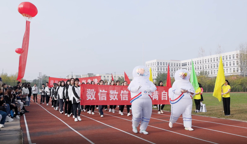 在国旗队、彩旗队、鲜花队、裁判员方阵的带领下、数信学院代表队迈着矫健的步伐,精神抖擞走过主席台进行体育文化展演,尽显数信学子昂扬向上的精神风貌。