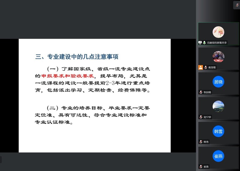 专家们首先肯定了学院近年来的发展和取得的成绩,尤其在优秀人才引进和科研成果方面的进步给人印象深刻。专家指出专业建设要有长远规划和顶层设计,结合买球官网具体情况要找准特色定位和影响力辐射,同时要注重政策层面的引导和激励。专家还指出要关注行业特色,结合相关领域,发挥团队作用,做有组织的教科研,充分调动教师个体的积极性。专家们还就专业建设过程的注意事项给出了详细指导。他们指出:要清楚了解省级一流专业建设点的申报要求和验收要求,提早布局,尤其是一流课程的建设一般要提前2-3年进行重点培育;课程目标如何达成、达成度如何计算、未达成的原因、如何进行改进等要有明确的计算方法和说明;省部校级文件的收集学习与讲解、专业建设材料的收集与整理、申报书验收报告的撰写等工作都要有专人负责,且有若干个团队协同工作;课程和教材要注意校内辐射和校外推广;建设成果不仅是教师的成果,更要重视学生的成果和获奖;要构建完整的教学质量保障体系和常态化监控机制。