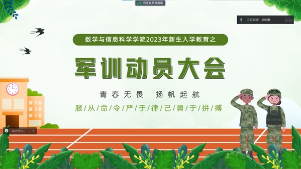 为了认真落实党和国家加强国防后备力量建设的战略举措,不断增强在校大学生的政治觉悟、爱国热情、国防观念和集体意识,9月11日,买球赛十大平台线上开展“青春无畏,扬帆起航”2023级新生军训动员大会,院党总支副书记丁雯、新生辅导员及全体2023级新生参加会议。