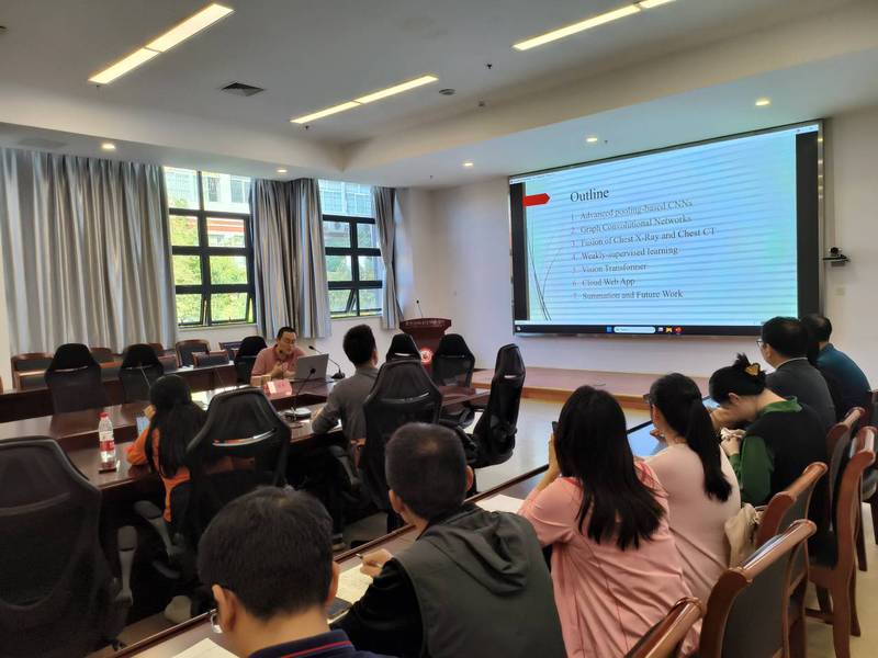 张教授是作为2019-2023年Clarivate全球高被引科学家,合著400多篇同行评审文章,其中有超过60篇ESI高引论文和6篇ESI热门论文。他担任了Neural Networks、IEEE TTS,IEEE TCSVT,IEEE JBHI等副主编,曾担任60多个国际会议(包括20多个IEEE或ACM会议)的大会级别主席。在给买球官网专业教师的报主要告围绕医学图像分析的高级信息科学与技术进行,旨在提升大家的学术视野,展开面对面的学术交流。张煜东教授介绍了研究小组在医学图像分析方面的信息科学和技术的工作和进展,尤其是深度学习及其重要网络的研究和应用。张教授的报告分享了很多新思想、新技术和新方法,开阔了大家的视野,并对年轻教师如何做好科研给出了有益的建议。