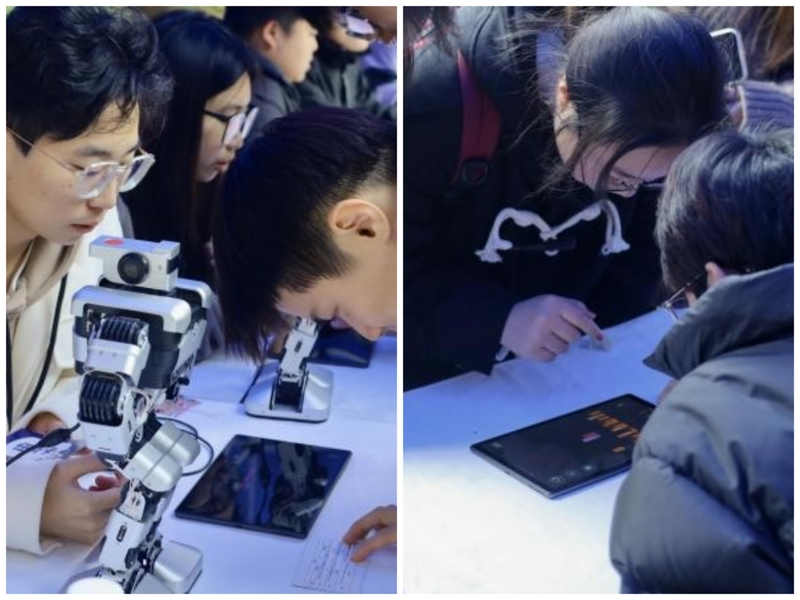 在机器人互动区,同学们有序抽取任务卡,在志愿者的引导和帮助下通过平板上的APP控制机器人说出“博爱塑魂”、说出“你好,南京特师”、向前走、挥舞手臂等任务,体验智能操作、灵活运用简单的编程。