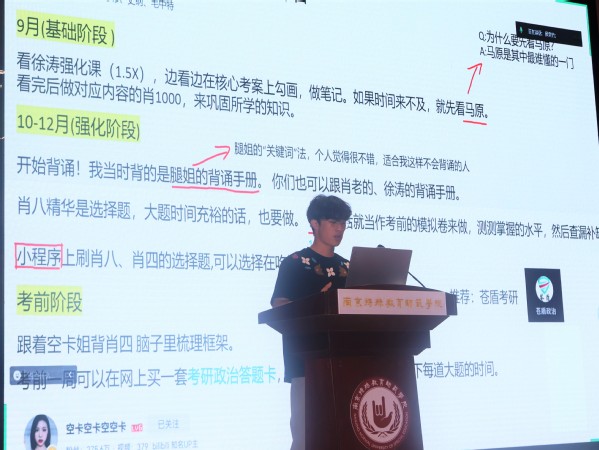 六位主讲人分别从跨专业考研、考研相关政策、各科学习方法、科目复习时间分配、备考过程阶段性冲刺、境外升学等不同角度出发,帮助同学们更好地了解考研信息,找到适合自己的考研之路。他们又以自身为例,提醒同学们复试时的注意事项,面试时需注意的仪表与礼仪。分享内容面面俱到、条理清晰,讲解时语言鞭辟入里,令在座学子们受益匪浅。
