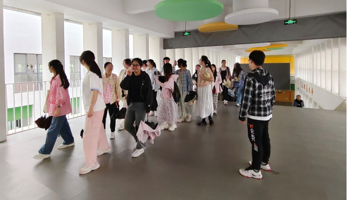 上午的课堂观摩结束后,李锦锋和孙丽老师带领学生们参观校园,详细介绍了现代中学的教学设施和功能教室。从音乐实验室到书法教室,从心理咨询室到体育场,南师附中新城学校的现代化教学设施给同学们留下了深刻的印象。在李锦锋老师的讲解下,同学们不仅对学校的硬件设施有了更直观的了解,也对中学教育教学活动有了更清晰的认识。这一过程中,大家积极提问、热烈讨论,现场学习氛围浓厚。