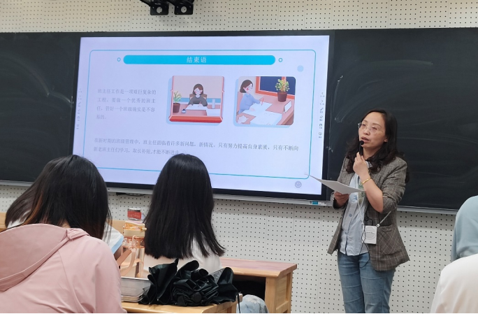 观摩课程结束后,王雅静和王俊贤老师分别为同学们带来了两场讲座。王雅静老师从班主任的角度,围绕“教学管理:中学教师教学管理”主题,讲授了班主任应具备的教育理念。她强调,班主任需要增强管理意识、学会换位思考、赏识和宽容学生,努力创造良好的班风和学风。王老师通过实例分享了许多管理技巧和经验,鼓励师范生们不断提高自身素质,虚心学习其他班主任的长处,取长补短,不断进步。王俊贤老师则从“特色课堂与教育理念及教学研究”的角度,详细介绍了学校的课程内容、“四立课堂”教学实践及其成果。他强调,教育不仅仅是知识的传授,更是对学生综合素质的培养。通过具体的案例和实践经验,王老师鼓励各位同学积极参与教学实践,亲身感受教育的魅力。