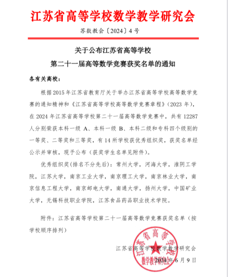 近日,江苏省高等学校第二十一届高等数学竞赛在全省各大高校隆重举行。买球官网买球赛十大平台数学系老师们辛勤付出、精心指导,带领学生们勇攀高峰,最终斩获了3个一等奖、11个二等奖和14个三等奖的辉煌成绩,创下了买球官网近五年来在该竞赛中的最佳纪录。